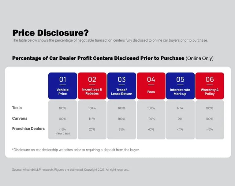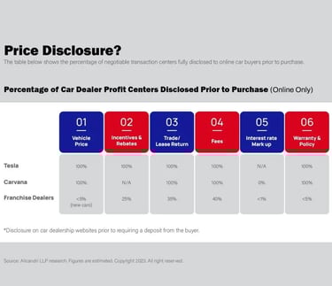 These types of behaviors have led to an increased distrust of dealers and gave rise to consumer’s seeking alternatives from companies like Carvana, CarMax, and Tesla (and others), who practice a much more transparent model when it comes to selling vehicles. I am not saying these companies don’t have their flaws also, as they certainly do, but their level of transparency & disclosure is usually higher than many traditional brick and mortar dealerships. Alicandri LLP recently put out a study (below) that focused on price disclosure that is making its way around the web these days. It demonstrates how much different the sales models can be when it comes to disclosure of price on certain items that are part of the typical car sale transaction. I would agree with their percentage findings from my first-hand experience.