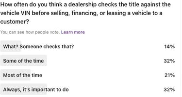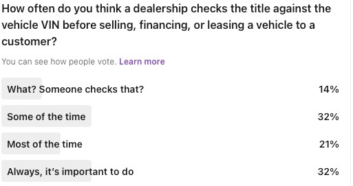 As an avid car enthusiast and someone who helps people buy and sell cars often, I am always amazed that I have only once had a dealer take a vehicle’s title presented in the F&I office outside to check the VIN against the car. I watched a very astute Honda F&I manager do it once. He appreciated this above story very much when I saw him do it and told him that he was a rarity, but it got me thinking about how often dealers or individuals really check the title and VIN when selling or buying a vehicle. Prior to doing this article, I put out the poll below on LinkedIn. The results were a bit surprising on the trust people put in this check being done.